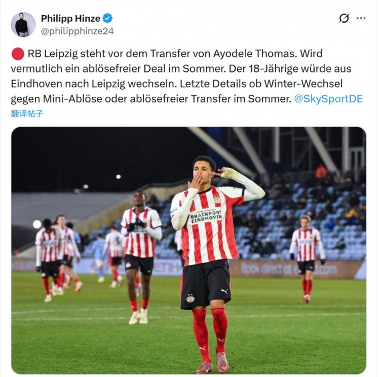 阿约德勒·托马斯与埃因霍温的合同今夏到期,莱比锡接近敲定这位小将, 目前交易的最终细节仍在讨论之中——是冬窗低价提前加盟,还是等到今夏自由转会。